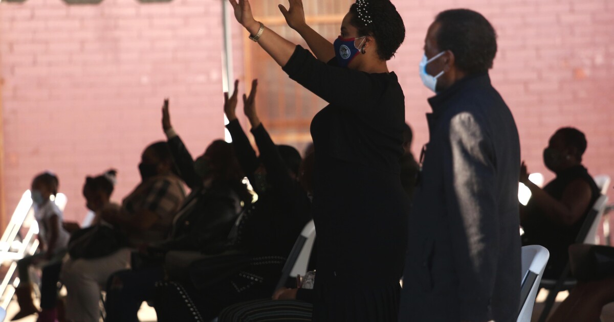 Najuma Smith-Pollard, pastor at Word of Encouragement Community Church in Pico-Union, said her congregation held a virtual pre-Christmas worship Wednesday night. Smith-Pollard, who pastors about 160 families and knows three people who died from the virus in the last month, led the service from a studio with a musician.